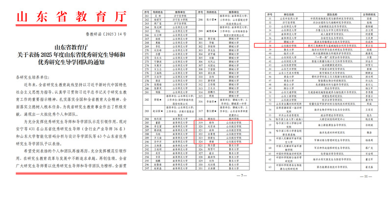 近日,山东省教育厅发布2025年研究生教育领域表彰名单。我校在本次评选中成绩斐然,共有6名教师荣获“山东省优秀研究生导师”称号、1个团队荣获“山东省优秀研究生导学团队”荣誉称号,受到表彰奖励的总量创历史新高,标志着我校研究生导师队伍建设质量迈上新台阶。