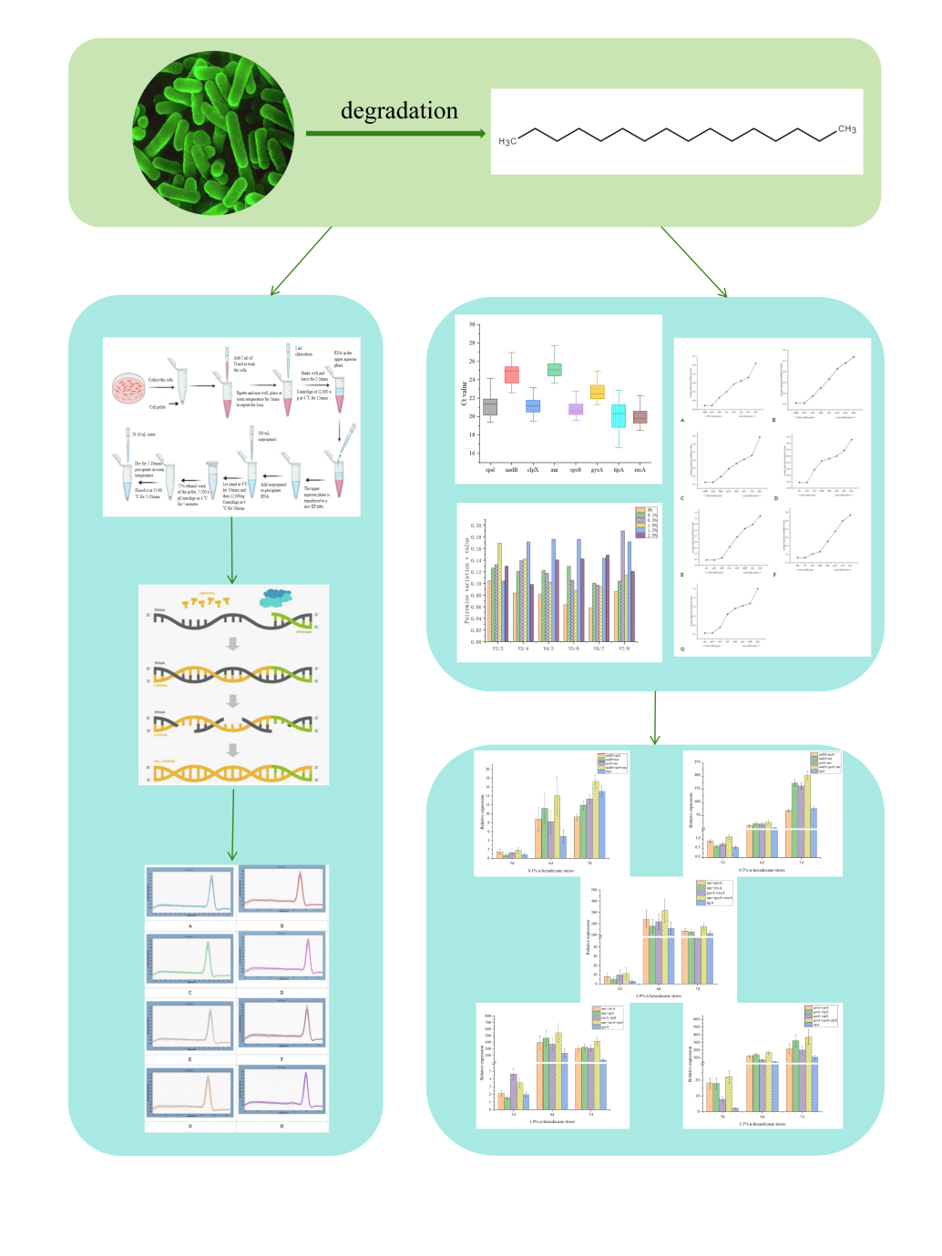 铜绿假单胞菌L10是从黄河三角洲芦苇根系分离的功能菌株,兼具长链烷烃降解、生物表面活性剂产生及植物生长促进能力,但其分子研究体系与遗传操作效率的不足,限制了该菌株的应用潜力。刘龙祥老师团队针对这两大核心问题展开攻关,形成系列研究成果。在发表于《BMC Microbiology》的研究中,团队聚焦实时荧光定量PCR(qPCR)技术的准确性关键——内参基因选择。通过筛选8个候选内参基因,结合四种权威算法评估不同正十六烷浓度胁迫下的基因表达稳定性,最终确定anr和nadB为最优内参基因组合,解决了该菌株基因定量研究中“内参选择无依据”的问题,为后续降解功能基因解析提供标准化工具。另一项发表于《Chiang Mai Journal of Science》的研究,则针对菌株遗传改造效率低的瓶颈,通过单因素实验与响应面法优化电转化关键参数,使转化效率较未优化条件提升37倍。同时,团队成功构建携带红色荧光蛋白的重组质粒,实现荧光蛋白在该菌株中的高效稳定表达,为追踪菌株在污染环境中的动态提供可视化研究手段。