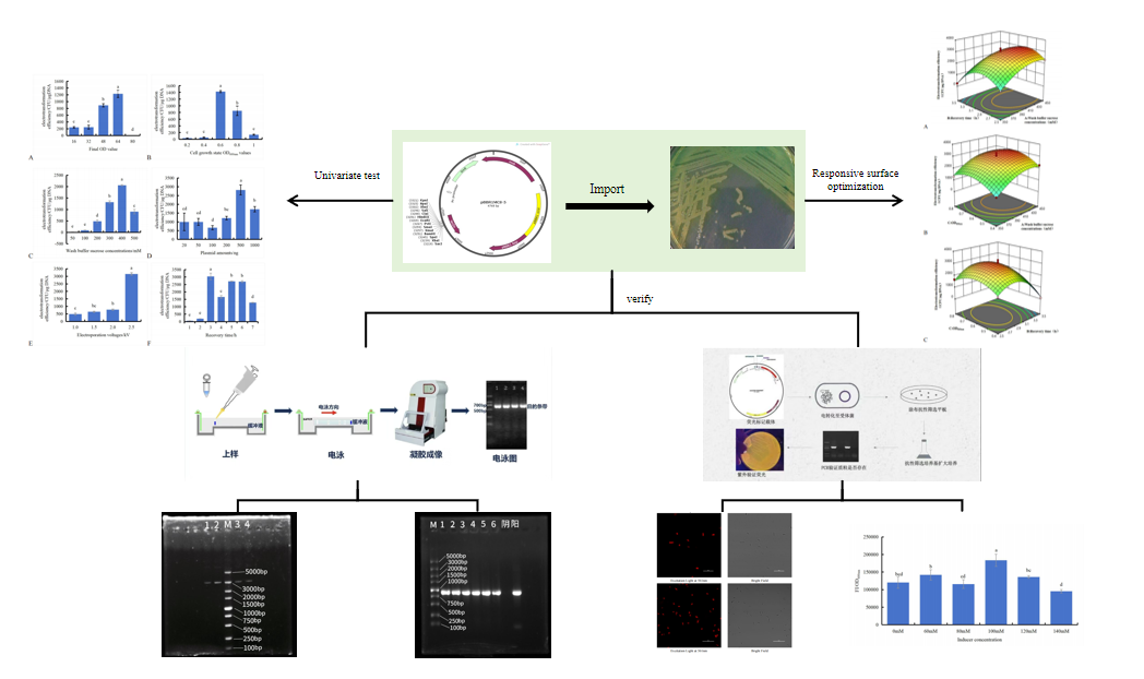 图 2 铜绿假单胞菌L10电转化条件的优化及荧光蛋白报告系统的构建