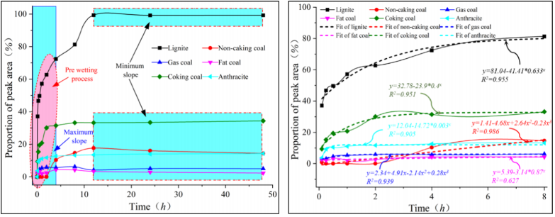 图 1. 表面活性剂 (FCS) 在不同煤润湿过程中的峰面积百分比以及拟合图